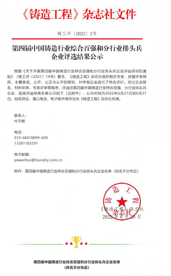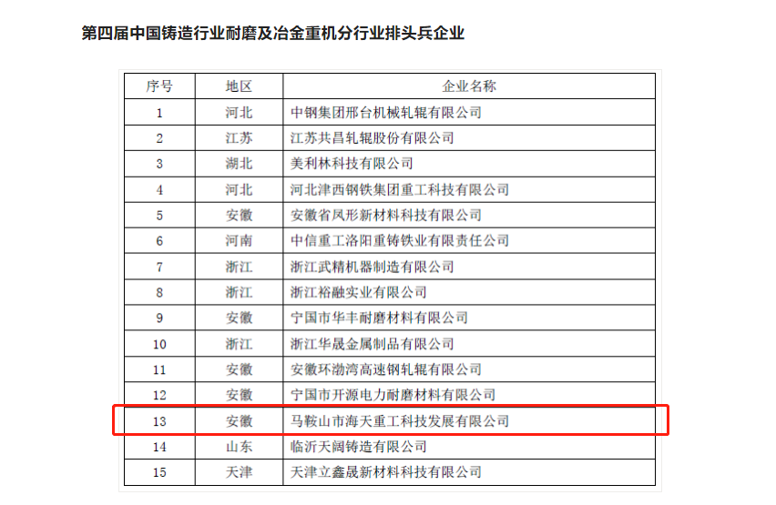根據(jù)《關(guān)于開展第四屆中國(guó)鑄造行業(yè)綜合百?gòu)?qiáng)和分行業(yè)排頭兵企業(yè)評(píng)選活動(dòng)的通知》(鑄工評(píng)〔2021〕14號(hào))要求,《鑄造工程》雜志社組織相關(guān)專家,依據(jù)評(píng)審細(xì)則,本著客觀、公開、公正與公平的原則,對(duì)申報(bào)企業(yè)進(jìn)行了綜合評(píng)價(jià)。經(jīng)過企業(yè)報(bào)名、材料初審、專家評(píng)審等程序,評(píng)選出第四屆中國(guó)鑄造行業(yè)綜合百?gòu)?qiáng)、分行業(yè)排頭兵企業(yè)。海天重工被評(píng)選為“第四屆中國(guó)鑄造行業(yè)耐磨及冶金重機(jī)分行業(yè)排頭兵企業(yè)“,這是海天重工獲得的象征行業(yè)地位的又一個(gè)標(biāo)志性榮譽(yù)。